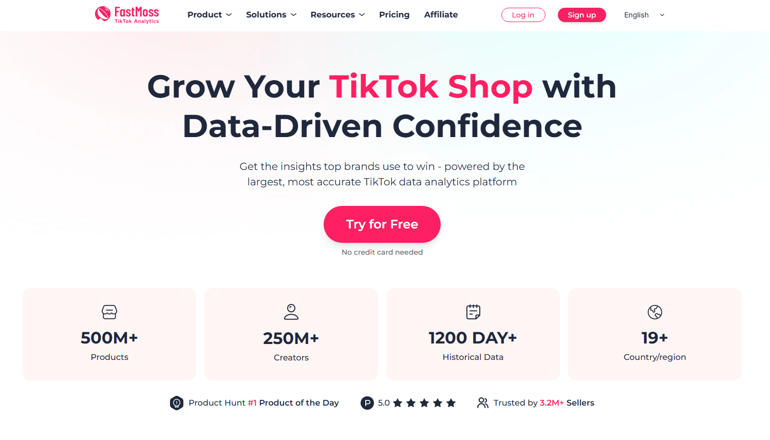 FastMoss is one of the most recognized names in the TikTok Shop software space, and for good reason. Its public site pitches a huge data footprint, including 500M+ products, 250M+ creators, 1200+ days of historical data, and support across 19+ country/regions. It also includes creator discovery, product analysis, video discovery/monitoring, LIVE data, ads, shops, and AI tools.