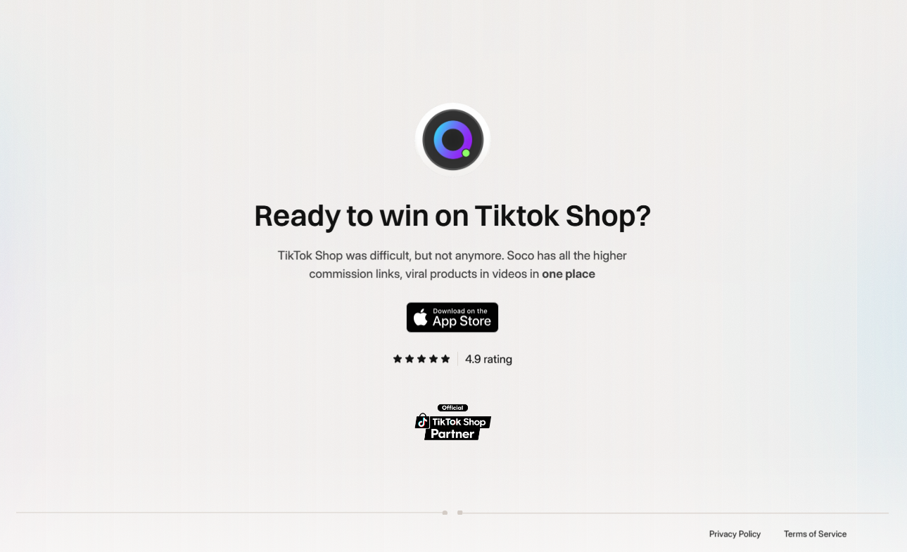 Soco is interesting because its public messaging is very affiliate-forward. Its website says it has higher commission links, viral products, and videos in one place, while its App Store listing describes it as an app for TikTok Shop affiliates to find viral videos, products, and higher-commission offers.