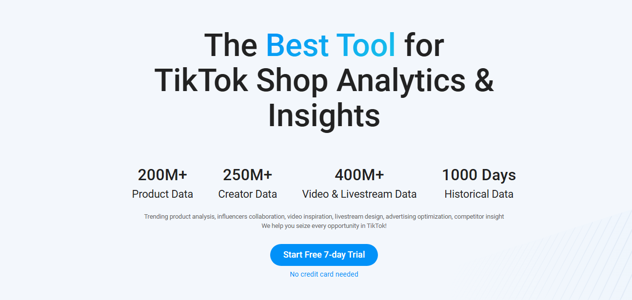 Kalodata is another major player in TikTok Shop analytics. On its site, it describes itself as a data analysis platform specialized in TikTok ecommerce and says it covers trending products, creators, short videos, livestreams, market research, and competitive analysis for sellers, brands, creators, and affiliates.